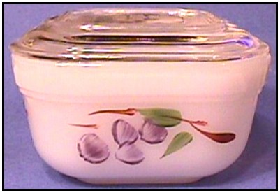 Vintage Fire-King Gay Fad Milk Glass / White Glass 4" Refrigerator Jar With Clear Glass Lid And Colonial Rim~ Very good condition; two minor paint flakes to grapes which measure 3/16" x 1/16" and 1/16" x 1/16". No chips, cracks or hairlines; lid impressed "Oven Fire-King Wear 12"; jar bottom impressed "Oven Fire-King Wear 13"; measures 4" x 4" x 2-1/4". |